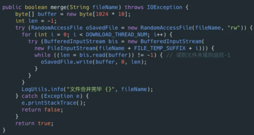 RandomAccessFile 可以帮助我们合并文件分片,示例代码如下: